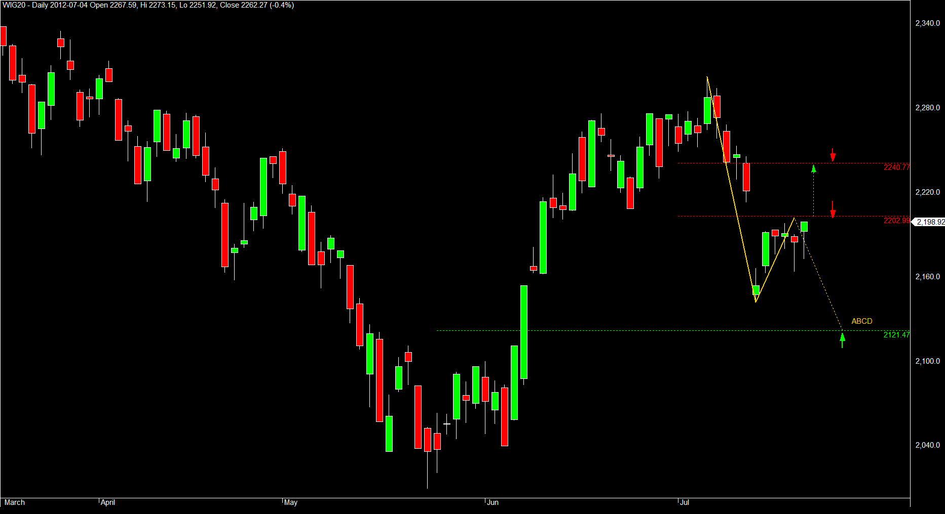 Na wykresie oznaczyłem istotne punkty oporu fibo i jedno istotne wsparcie fibo. Wsparcie wzmocnione jest strukturą pro-wzrostową ABCD przez co staje się ciekawym miejscem do szukania strategii L-owych. Wybicie oporu 2202 otworzy drogę do oporu 2240.