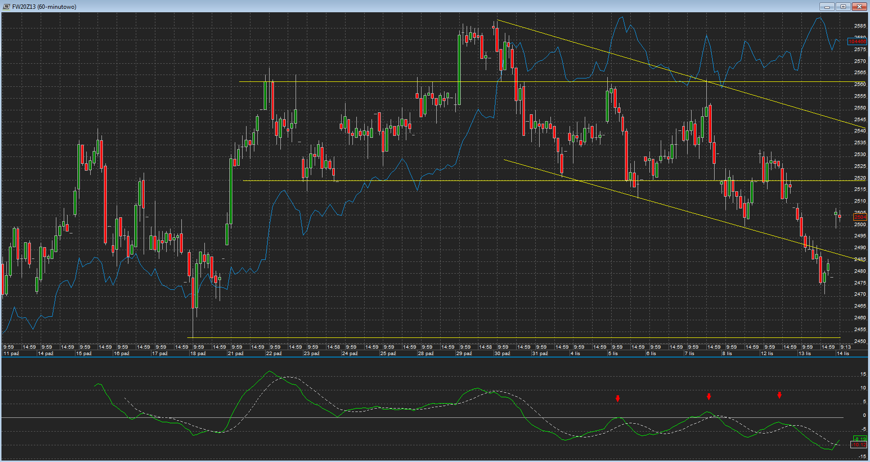 Odbitka w krótkoterminowym trendzie down. Wyszliśmy dość dynamicznie poza kanał więc powrót nie jest niczym nadzwyczajnym. ładna łuka na starcie, przydałoby się jej nie zamknąć jeśli mamy iść up, wygrzebanie ponad 2520 będzie sygnałem ocieplenia. Wsparcia opory i kanałek na wykresie 1h.