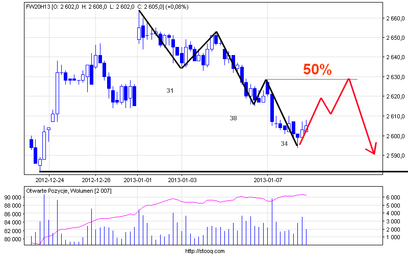 Jak na razie wykonaliśmy 5 falek w dół (czarna kreska) po których spodziewam się malutkiego odreagowania (czerwona kreska) i kontynuacji spadków. Zejście w cenach klozet poniżej 2582 (czarna pozioma kreska) potwierdzi obecną bezzzsę.