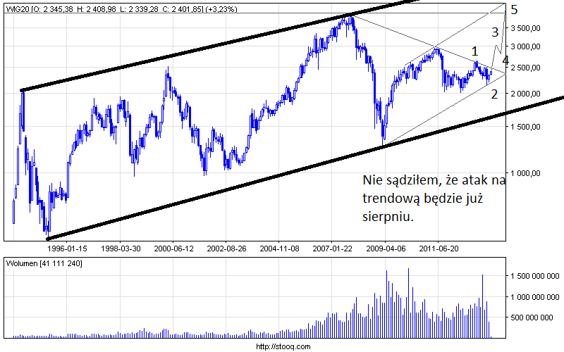 A może po prostu dojedziemy do górnego ograniczenia kanału, następnie zaczniemy korektę i w międzyczasie pojawią się informacje na temat OFE i odwiedzimy poziom 1800 ( z tą hossą byłbym ostrożny). Oczywiście mogę się mylić, ale nie można tego wykluczyć.