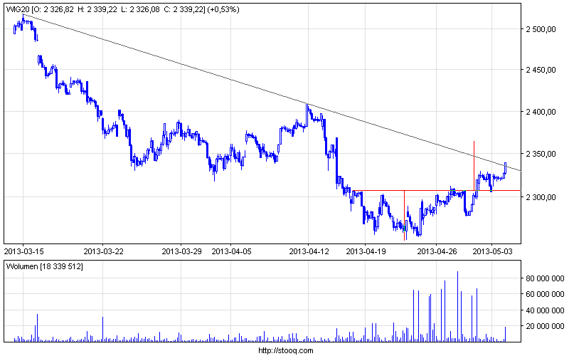 Biorąc pod uwagę kilka ostatnich sesji widać że popyt ma ochotę powalczyć o więcej. Nie twierdzę że w maju czeka nas hozzzsa ale ostatnie ratowanie minimów cieniami na dziennej świeczce na dość znaczących obrotach pomimo krótszego tygodnia wnosi sobą jakiś tam element uspokojenia i przynajmniej kontynuacji prób odreagowania. Utrzymanie poniedziałkowego otwarcia i ładne wykończenie sesji (znów fix) pozwala sądzić że to jeszcze nie koniec walki o wzrosty a kluczowym dla koniunktury w trakcie najbliższych godzin wydaje się zachowanie rynku w okolicach ubiegłotygodniowych maksimów bazowego - 2330 pkt które zaatakowaliśmy na fiksingu.