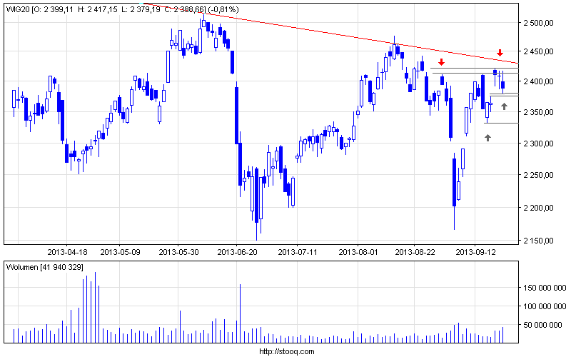 Mamy potwierdzenie oporu w okolicach 2410-20 pkt na bazowym czego nie możemy przekopać już od kilku dni po sławnej odbitce post ofesowej. Niewiele wyżej oporniki wzmacnia 9 miesięczna spadkowa (czerowona).