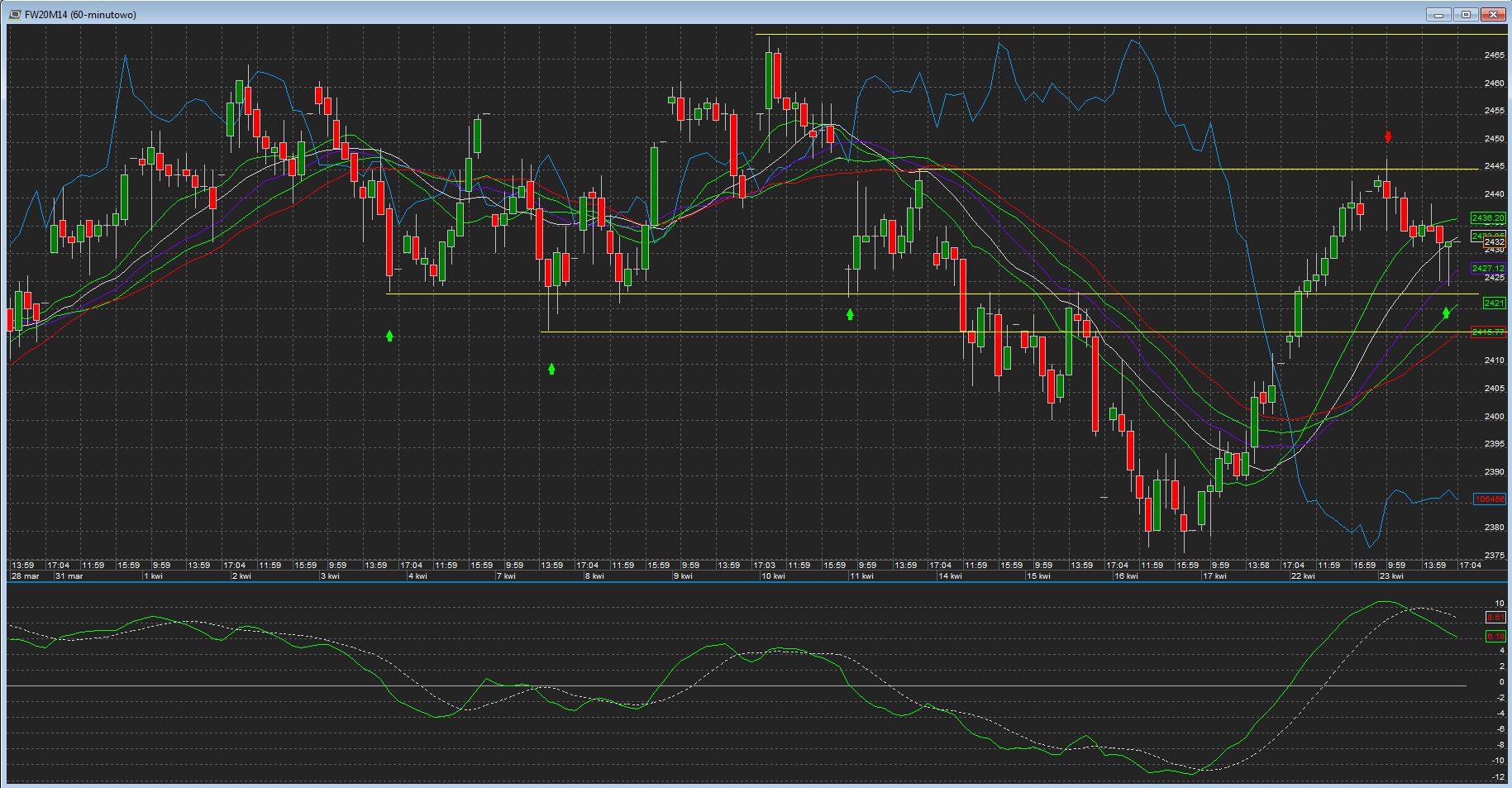 Wsparcia i oporniki na wykresie fut 1h. Gramy od ściany do ściany, krótszy ten i przyszły tydzień nie daje nadziei na poważniejszą aktywność i kluczowe rozstrzygnięcia.