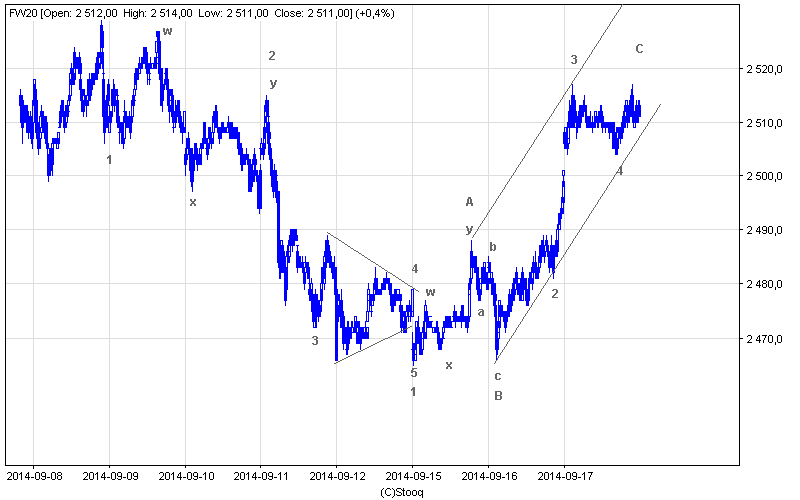 domniemana 5 fala w C (dotychczas bardzo niewyraźna) IMO może jutro nabrać rumieńców i rozwinąć się na wiele sposobów dzięki rezultatom dzisiejszej sesji w USA. Myślę, że jutro możemy trochę poszarpać w różne strony: może klin ;), może zwykłe przedłużenie fali 5 (nie mylić z wydłużeniem ;), a może płaska w 4 w C. Nadal nie wiem również jak w końcu jednoznacznie rozpisać początek fali C.