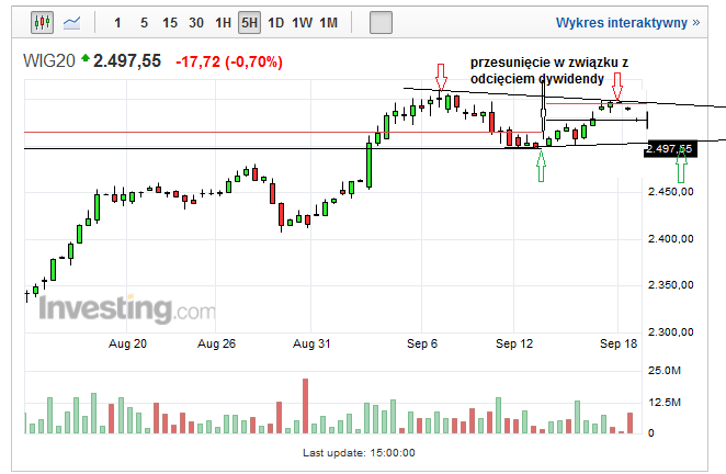 Wig 20 po przełamaniu kanału wzrostowego wykonał jedynie powrót do tego kanału i bez tego wybicia ciężko określić co się dzieje. Wybicie w górę może zagwarantować powrót do kanału wzrostowego.