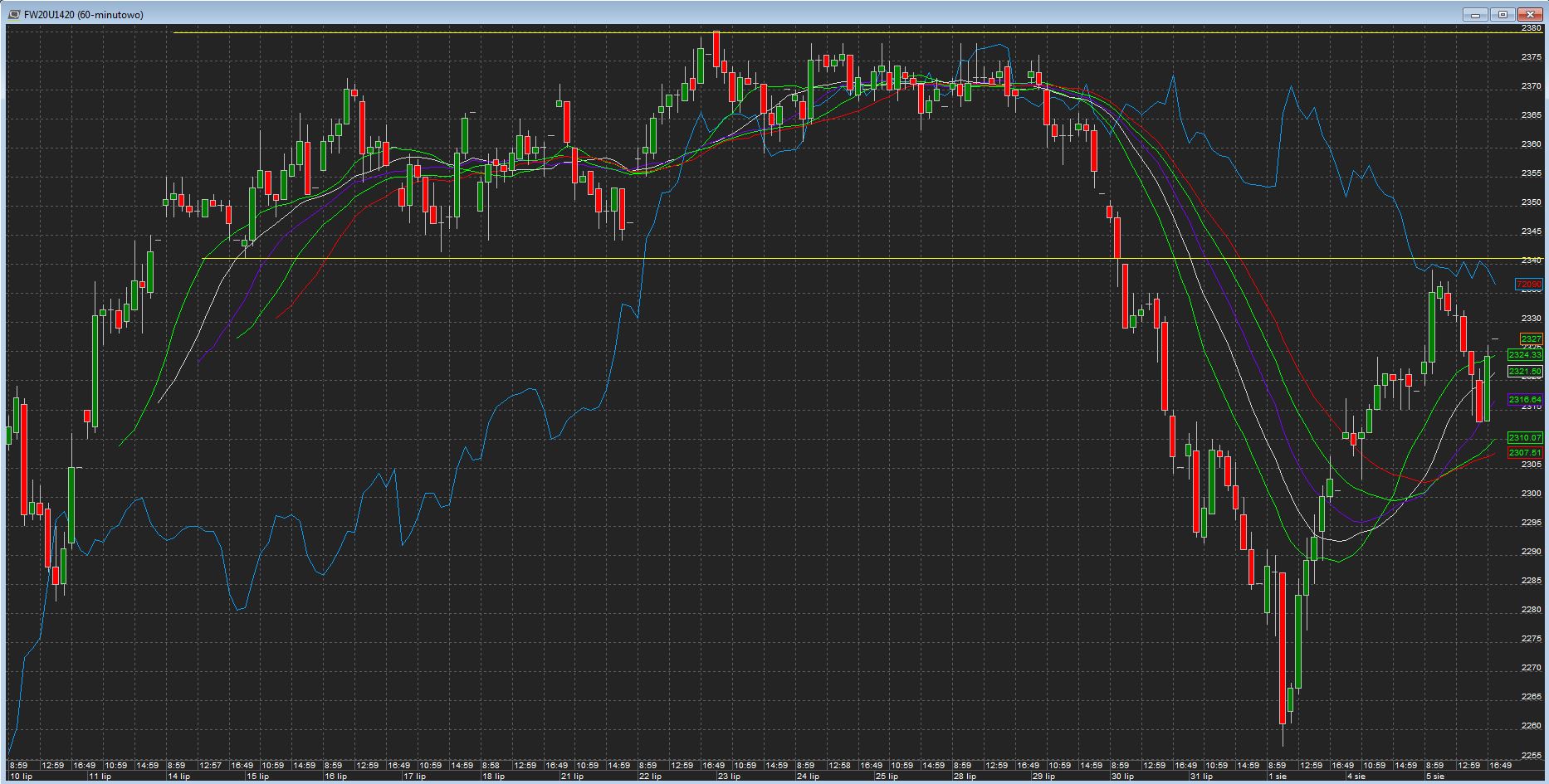 Wyjście nad 2340 w zakres ubiegłotygodniowej konsoli dawałoby nadzieję na powalczenie o coś więcej ale obawiam się, że wzrosty których byliśmy świadkami od piątku moga byc jedynie ruchem powrotnym do przekopanego wparcia - na wykresie fut 1h - w takim wypadku czeka nas zwałeczka. Sygnałem że coś się może wydarzyć w dół byłaby utrata najszybszych dołków na 2313 i 2303.