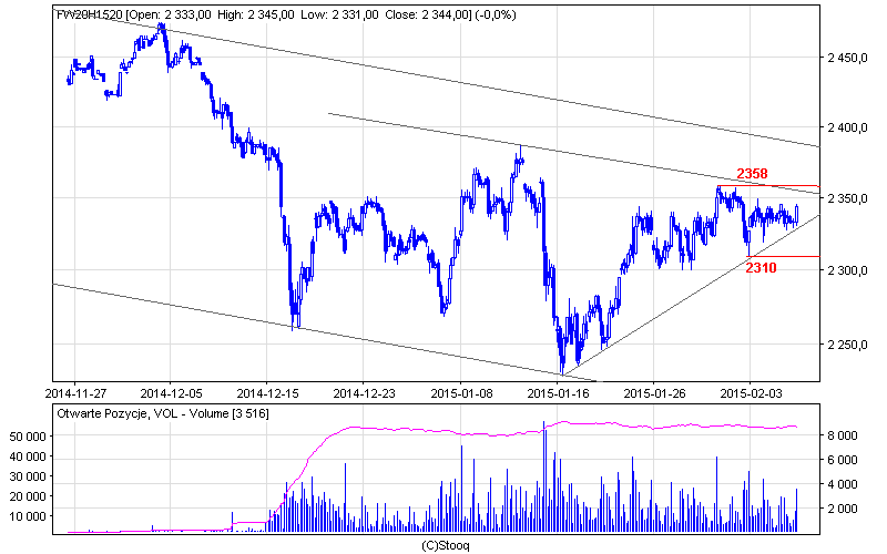 Rozstrzygnięcia wydają się powoli przybliżać, ile można łazić bokiem :) Jak widać na załączonym wykresie futa 1h od góry ogranicza ekstremum 2358 i kreska spadkowa, na dole wspomaga kreska wzrostowa która już kilka razy broniła trendu, sadzę że filtr na 2310 powinien potwierdzić i zdynamizować ruch. Z argumentów z poprzednich komentarzy bardziej prawdopodobny wydaje się ruch w dół ale pozostaje czekać na wybicie i reagować pozycją z bliskim stopem i ewentualną odwrotką gdy wylecimy z rynku który później zawrócił. Po męczącym tygodniu czystej szulerni nie ma gwarancji że wybicie nastąpi w piątek. Trenujemy cierpliwość :)