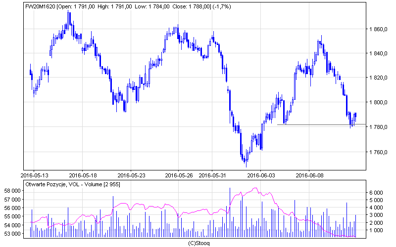 Utrata najszybszego wsparcia w okolicach 181x przyniosła zejście pięto niżej. Trwa potyczka na poziomie 178x z którego wyjście dołem (co widać na wykresie) to prosta droga do testu minimów 1748 pkt, tak więc jest o co walczyć.