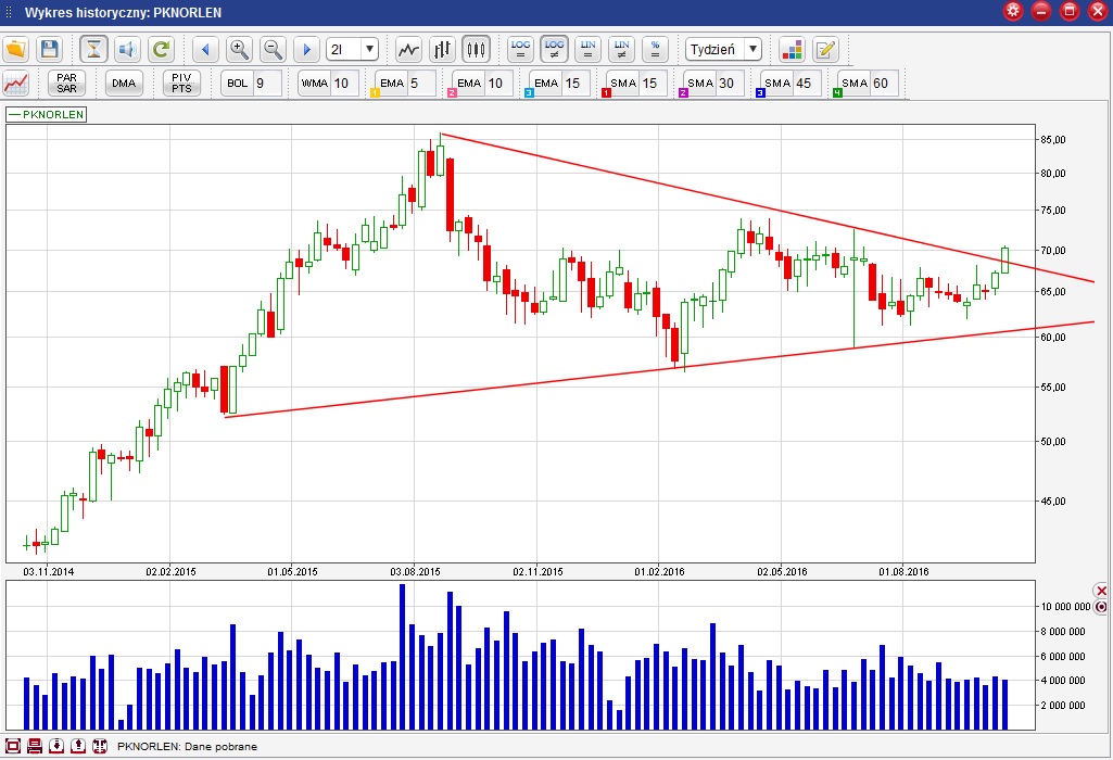 Wygląda na to, że PKN się faktycznie wybił. Kupiłem dzisiaj mały pakiet - pozycja średnioterminowa. Zlecenie zabezpieczające na poziomie ~63 - wejście powrotne do strefy konsolidacji plus nowe, lokalne minimum. Zasięg wybicia w wersji optymistycznej to 95 zł (w perspektywie kilkunastu/kilkudziesięciu tygodni oczywiście), po drodze dużo ważny oporów typu historyczne maksimum więc należy trzymać rękę na pulsie. Kolejne pakiet kupię za kilka tygodni - oczywiście jak wszystko będzie dobrze szło.