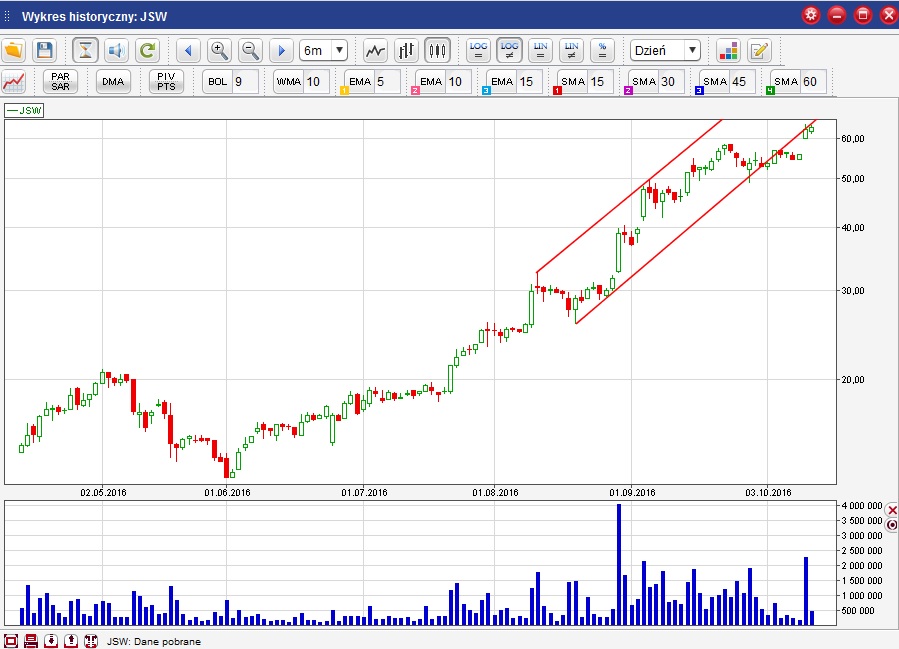 Tak widzę JSW. Wykres ten już wstawiałem wcześniej. Wyjście dołem z kanału wzrostowego nie musi od razu oznaczać trendu spadkowego - raczej spowolnienie trendu wzrostowego lub konsolidację. Możliwy powrót do kanału wzrostowego, co będzie równoznaczne z dynamicznym wzrostem. Co do krótkich pozycji to powtórzę raz jeszcze, uważam że to samobójstwo - mamy silny trend wzrostowy.