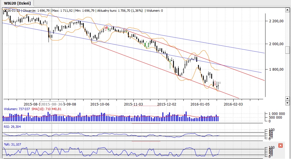 Rozpisanie impulsu w dół mamy w sumie zrealizowane, tak więc spadki mogłyby się na razie skończyć. Wyjście nad 1720 daje pierwsze longi. Zejście w dół w połączeniu z zamknięciem porannej luki uruchamia wczorajsze scenario w kierunku 1600.