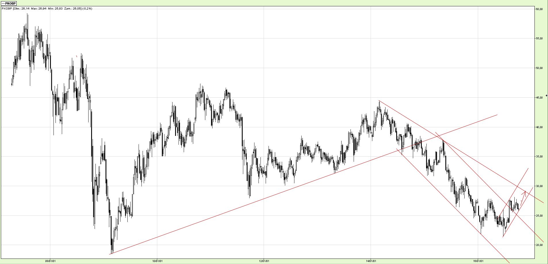 Wzrostom WIG20 może pomóc PKOBP, na którym widać konsolidację - akumulację po wyjściu górą ze średnioterminowego kanału spadkowego: