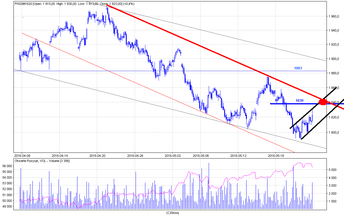 Założenie jest takie, że skoro poszła piątka w dół i jak pokazała poniedziałkowa sesja spadać dalej nie chce więc naiwnie liczymy na mniejszą bądź większą odbitkę ;) Aby miało to ręce i nogi wypadałoby przekopać kluczowy obszar zaznaczony na czerwono na załączonym wykresie futa a wtedy droga na ostatnie oporniki stanie otworem.