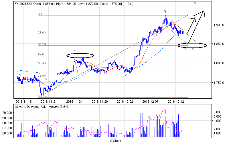 Obecne osłabienie nadal można uznać jako korektę tego co wzrosło. Z kresek 1 zniosła się w 38,2 to i 3 może zechce podobnie ;) co przy zależności 1,618 dla 2 plus poprzedni dołek daje prognozowane okolice 50 (dodatkowo połowa korpusu z ubiegłego tygodnia) Zawrócić może i z obecnych 23.6 (obie ver na załączonym wykresie) tak więc skoro polowanie na dołek nie ma sensu ;) to w miarę logiczny long intra mamy powyżej 1886 – obie średnie + kanał + szczyty intra co nie oznacza że od razu idziemy na nowe maxy w hiopotetycznej 5 i możemy się jeszcze pobujać w korekcie oby nie niżej niż szczyty obecnej 1. Zaczeło się rolowanie pozwólmy się grubasom spokojnie przesiąść i do piątku głebsze analizy sobie darujmy ;)