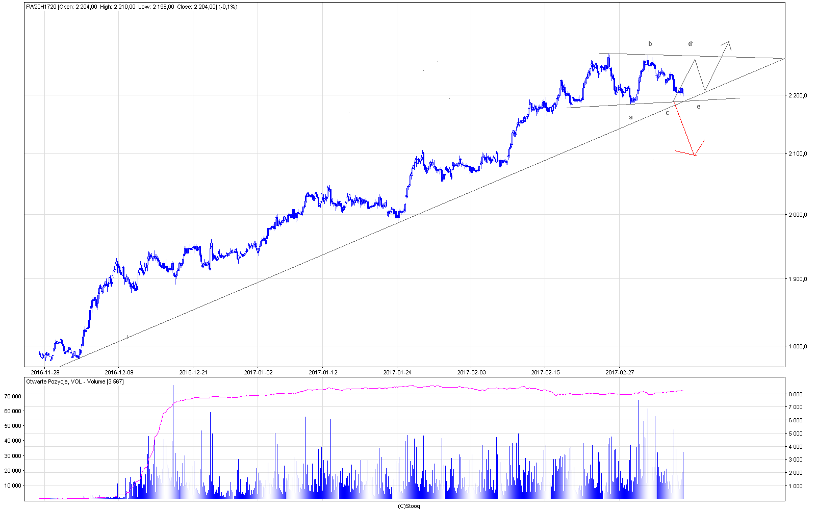 Od kilku sesji bez większych zmian, korekta w toku. Jak widać na wykresie przekopanie hipotetycznego trójkąta i kreski trendowej w dół sygnalizuje wyraźne es i pogłębienie zejścia. Inaczej kręcimy korektę bokiem w trójkącie z oczekiwaniem na kierunek wybicia.