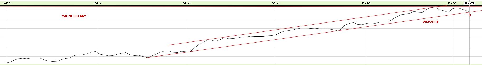 Na pierwszym wykresie widać odbicie WIG20 od oporu, a na drugim ten sam wykres w powiększeniu pokazuje, że WIG20 jest dokładnie na wsparciu hossy i jutro będzie dzień prawdy: