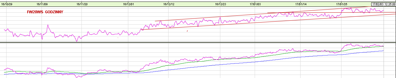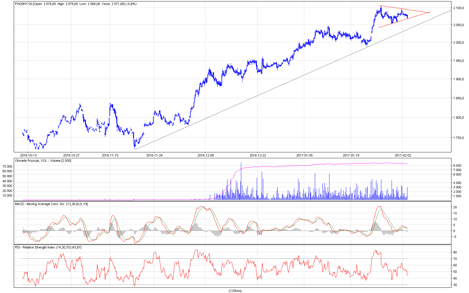 Zgodnie z tym co widać na wykresie mamy ostygnięcie trójkątem przy lekkim spadku lopu przy mniejszych wolumenach na kasowym - ewidentna korekta - tak więc pozostaje czekać na wybicie i reagować zgodnie z kierunkiem. Dotychczasowy trend preferuje wyjście górą ale ostrożność po takim ruchu jest bardzo wskazana - pomocne powinny być poziomy 47-54 i kreska trendowa - wszystko co niżej to próba esiny.