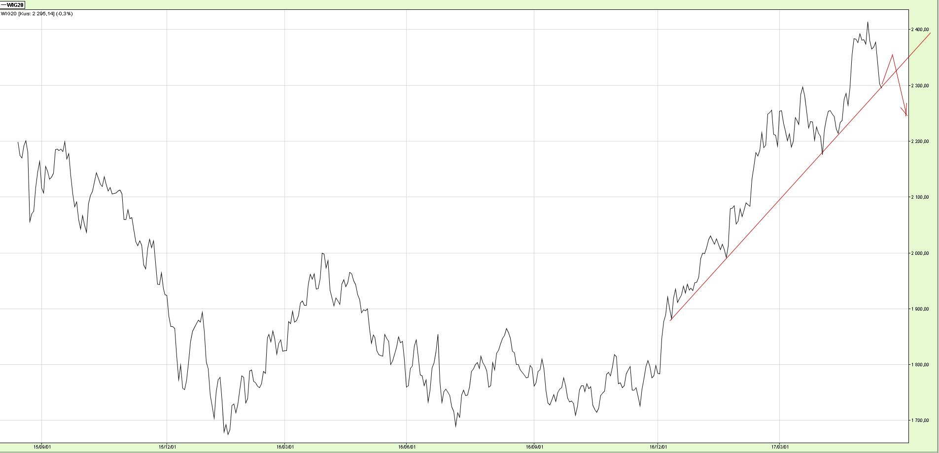 dla mnie es i koniec, oczywiście bronią 2300 bardzo ładnie i dobrze, bo byczek nie mógł dopuścić, by w jedną sesję prysł czar wzrostu, mogą mielić, podbijać, wyrok zostanie jednak wykonany już wkrótce, es rządzi i nie ma rady. Wig 20 umarł, tylko jeszcze o tym nie wie. Wczorajszy młotek to tylko modły księdza nad trumną. Będziemy poniżej 2200 i nie ma rady.