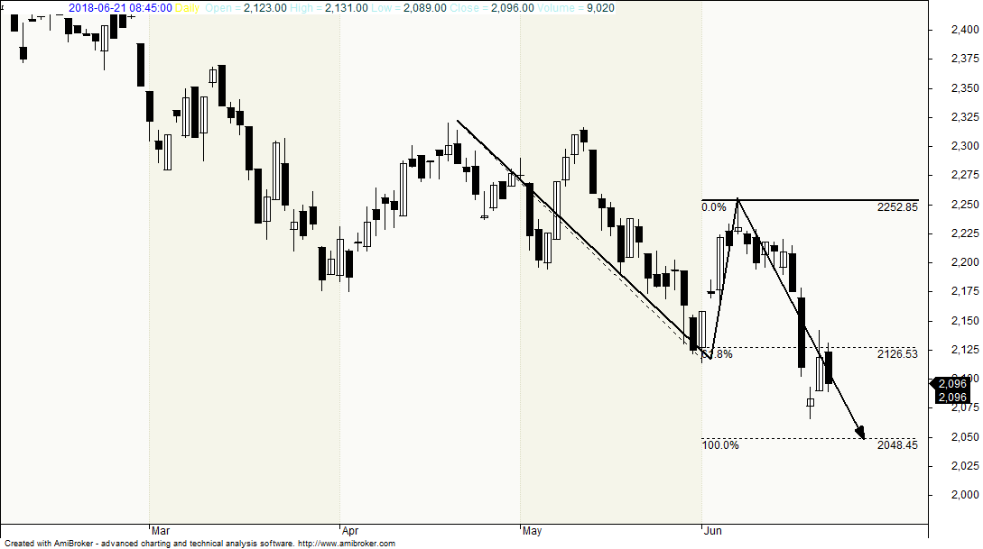Może to zrobić albo już wkrótce, odbijając się w okolicy 2070, albo nieco niżej - od strefy 2040-50. Trzeba też się liczyć z odbiciem jeszcze niżej - w pobliżu rejonu 2000.