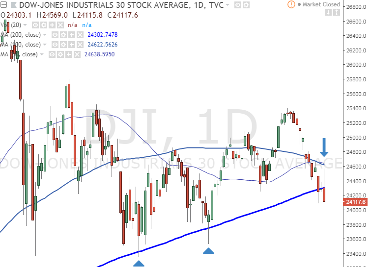 Poniżej wykres DOW po sesji wczorajszej gdzie układ średnich jest najgorszy ze wszystkich głównych indeksów ( dow/sap/nq/rut ) ... a close DAY wczorajszy po raz pierwszy od 2015 roku wypadł poniżej najważniejszej z nich : 200MA