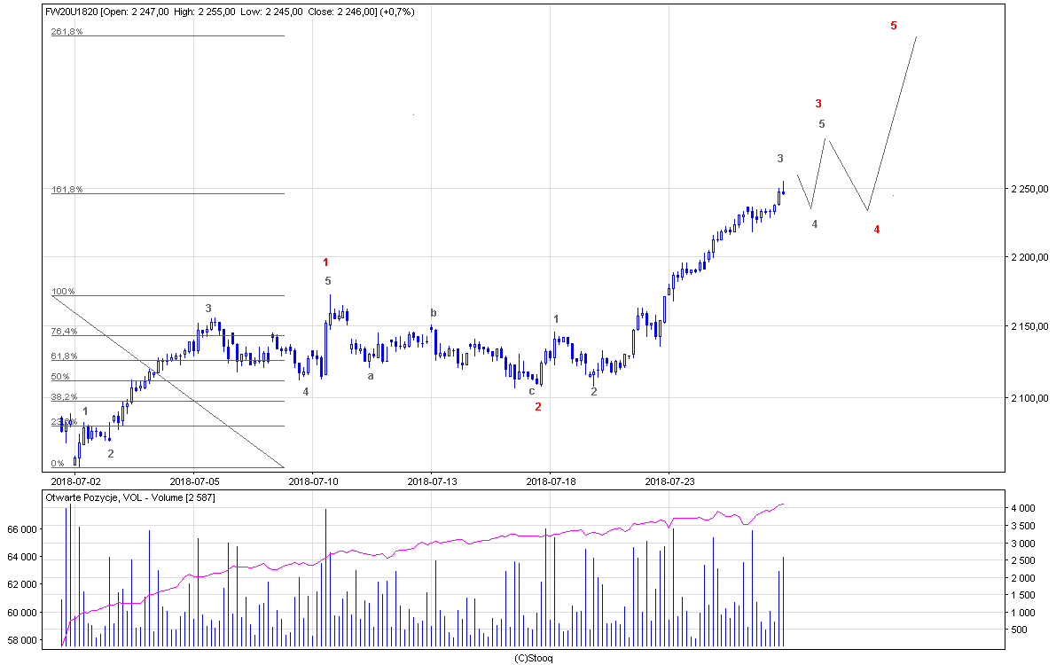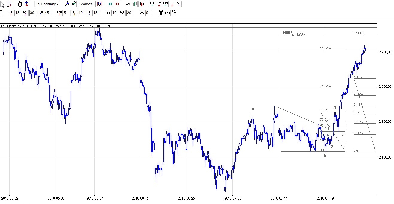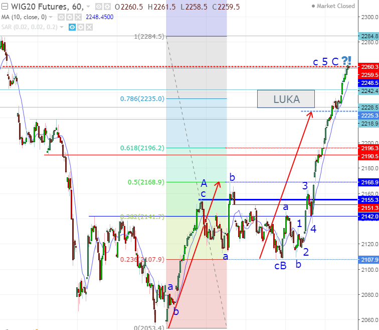 wydłużamy fale 5 może dojść do 2282, tutaj też mamy zasięg orgr-a=2284, szczyt 2285,ale może ich powstrzyma 38,2%-2277