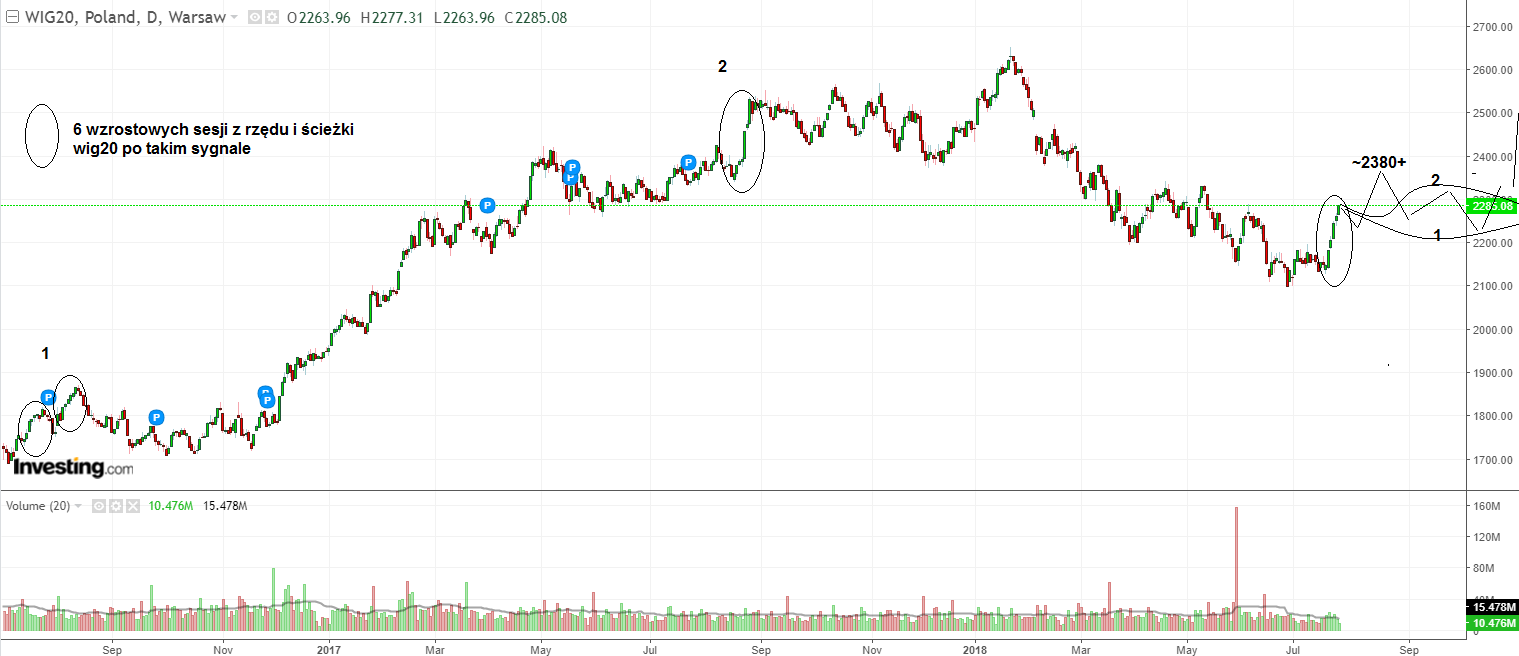Mamy już 6 wzrostową sesję z rzędu, taka sytuacja miała miejsce w ostatnich latach tylko 3 razy pomiędzy 18 a 25 sierpnia 2017 r. oraz w lipcu i w sierpniu 2018 r., w późniejszym okresie w tych przypadkach następowała jesienna konsolidacja a później rajd św. Mikołaja. W tym roku powtórka?