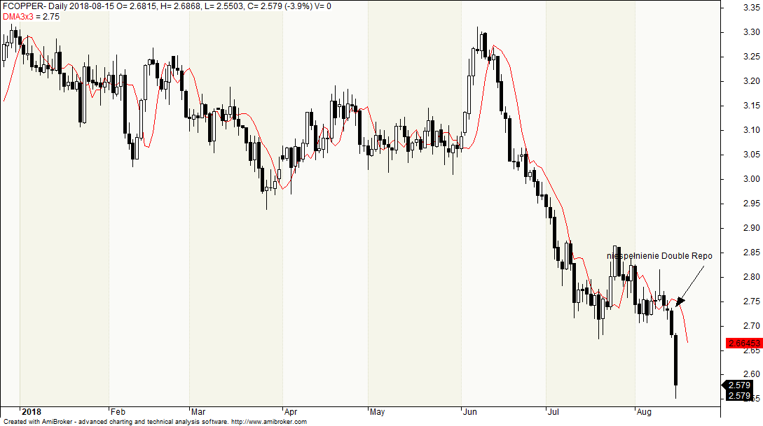 Jeśli chodzi o cały majatek to zagrałem S na KGHM za cały majątek.Sygnał na S miałem już wcześniej, ale potwierdzeniem było dla mnie formacja Dinapolego "niespełnienie Double Repo na COPPER. formacja została wyrysowana dwa dni temu i charakteryzyje się silnym ruchem w dół lub w górę w zależności czy jest na wzrosty czy na spadki. Jak na razie nie zawodzi. Spodziewam się silnego ruchu w dół na COPPER(miedzi) jeszcze przez co najmniej parę, parenaście dni. Jeśli spadki dynamiczne na miedzi to chyba i na kghm, tak ja rozumuję.Poniżej wykresik dzienny Copper i zaznaczony dzień utworzenia formacji