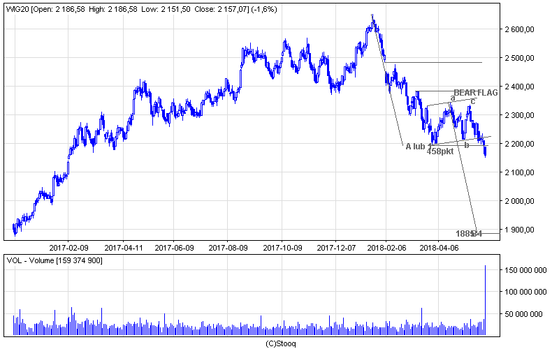 trzymając się książkowo AT ciężko zgodzić się z jakąkolwiek sugestią o kupowaniu rynku obecnie. Po FALI (załóżmy że było to A) wyprzedaży ze szczytu 2650pkt w20 przeszedł w okres konsolidacji/korekty w formie BearFlag z której to konsolidacji właśnie wybił się dołem. Co więcej , owo wybicie zostało już przetestowane a w środę dodatkowo potwierdzone, z dodatkowym uderzeniem obrotu. Kierując się najprostszą AT z możliwych oczekiwać należy zatem podobnych rozmiarów FALI (w tym przypadku C) lub alternatywnie FALI większych rozmiarów (słynna fala 3) - co wcale nie będzie czymś nadzwyczajnym.