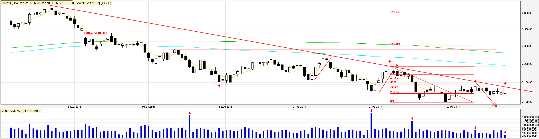 Wreszcie SP500. Wykres doszedł już do lokalnego oporu FIBO. Mamy harmonię 1:1 ABCD. Powinna być korekta do dołu. Może dzisiaj sie zaczęła? Być może. Dlaczego o tym piszę? Dlatego, że trudno sobie wyobrazić, że jeśli tam będzie korekta to u nas będzie rosnąć. Podejrzewam, że nasz wig20 wyprzedza już korekty na rynkach zagranicznych. Nie wiem czy jutro będzie tam spadać, może jeszcze jakiś ruch do góry tam będzie, może nie, ale nawet jesli będzie ruch do góry to nie będzie jakiś znaczący. Dla graczy pozycyjnych takich jak ja, to jest to sygnał, aby nie brać L na naszym indeksie. Nie mówię, że na DAX, SP500 itd to będą jakieś duże spadki, jakiś armagedon, ale powinna być jakaś korekta do dołu, moim zdaniem jest to kwestia dni, może jutro, może w następnym tygodniu?