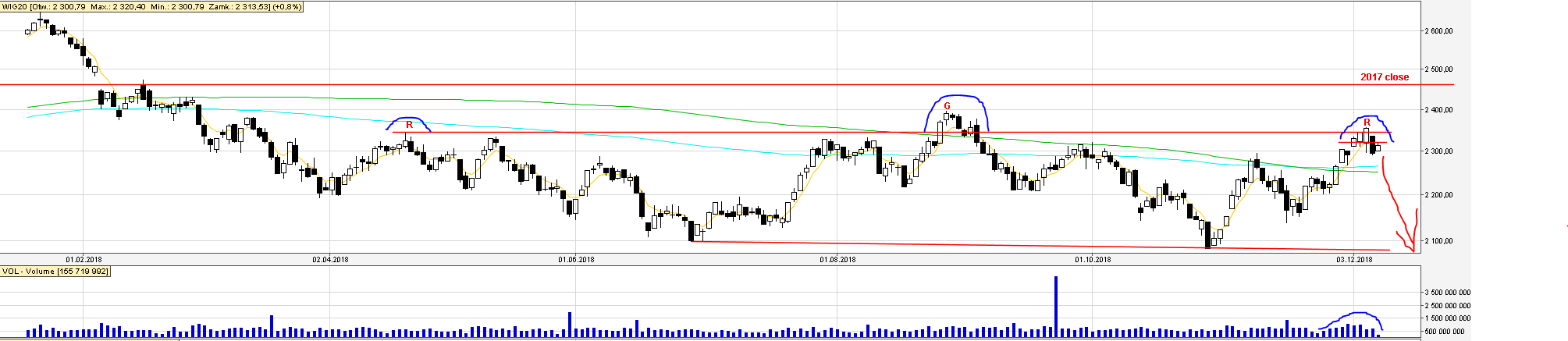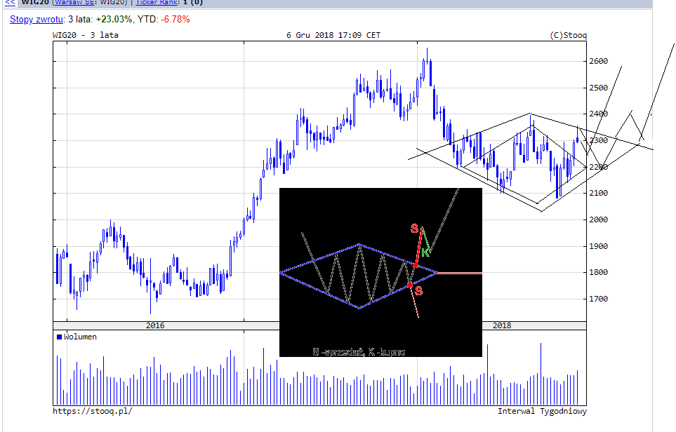 Póki co mój scenariusz z krachem w USA i mocnym GPW wypełnia się idealnie. Pierwotnie spodziewałem się Rajdu w grudniu to wtedy mielibyśmy mały diament i aktualnie korektę po wybiciu - czyli jeszcze z tydzień spadków i dalszy wzrost. Albo realizacja dużego diamentu, który wygląda książkowo i po dalszej konsolidacji w obrębie diamentu wybicie w którąś ze stron i intuicja podpowiada mi, że będzie to góra mimo tych wszystkich death crossów w USA...