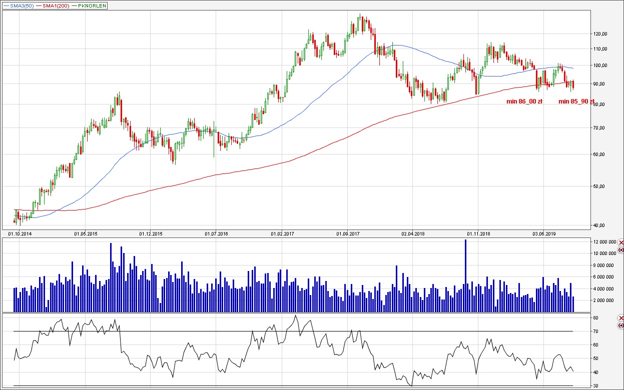 Ciekawa sytuacja według mnie jest też na orlenie. Do tej pory kurs skutecznie odbijał się w górę od średniej z 200 sesji. Przez ostatni rok, po każdym dotknięciu średniej następowało odbicie, minimum w danym ruchu zawsze było powyżej minimum ruchu poprzedniego. Aktualnie kurs od kilku dni jest poniżej średniej z 200 sesji, wyznaczył również minimum poniżej poprzedniego ruchu.