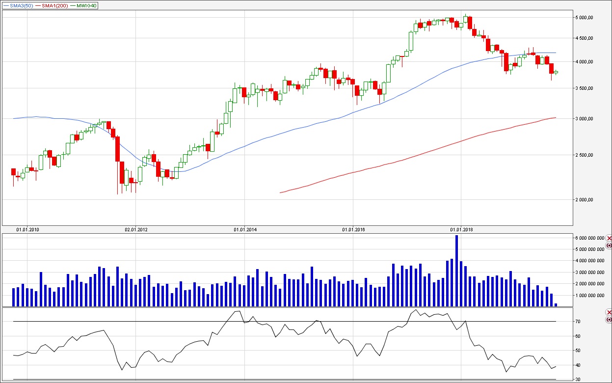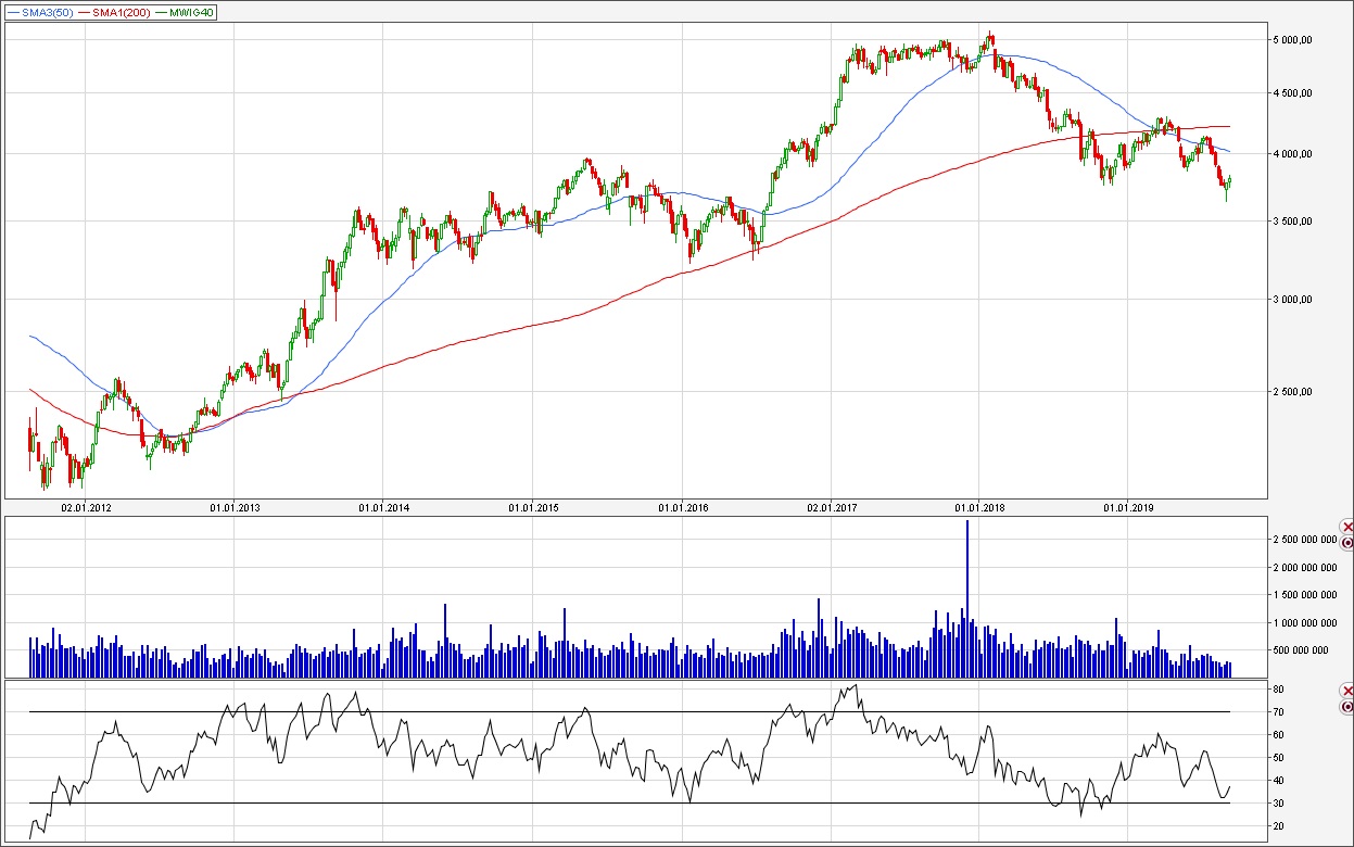 W przypadku mwig40 również posłużę się głównie średnimi z 50 i 200 sesji - kurs respektuje te średnie. W interwale miesięcznym widoczny jest spadek poniżej średniej z 50 sesji, która od wielu lat tworzyła skuteczny opór i wsparcie. W interwale tygodniowym, w którym kurs również respektował obie średnie, aktualnie znajduje się poniżej obu średnich, średnie z 50 sesji jest poniżej średniej z 200 sesji. Nadal trzymam krótkie pozycje, nie wykluczam rolowania kontraktów przez nawet 2 lata - zdecydowanie jest to długoterminowa operacja finansowa.