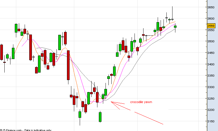 When the Jaw, the Teeth and the Lips are closed or intertwined, it means the Alligator is going to sleep or is asleep already. As it sleeps, it gets hungrier and hungrierá— the longer it will sleep, the hungrier it will wake up. The first thing it does after it wakes up is to open its mouth and yawn. Then the smell of food comes to its nostrils: flesh of a bull or flesh of a bear, and the Alligator starts to hunt it. Having eaten enough to feel quite full, the Alligator starts to lose the interest to the food/price (Balance Lines join together)á— this is the time to fix the profit.