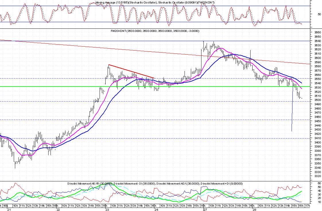 Mo?liwe jest te? alternatywne oznaczenie w ktˇrym obecnie robimy 4 (ruch od 2 do 5 mo?na rozpisaŠ jako sk?adaj?c? siŕ z piŕciu fal 3) . Jest to jednak scenariusz mniej prawdopodobny. Patrz?c z perspektywy intra mamy do czynienia z RGR (dzi przebiliÂmy liniŕ szyji) z zakresem ruchu w okolice 3450.