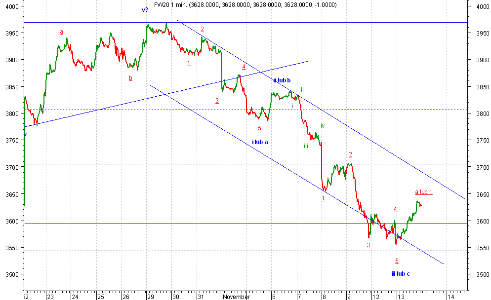 Dopuszcza to jednak prawdopodobienstwo, ze dzisiejszy wzrost moze byc poczatkiem korekty cxalego spadku (a w B). O sile rynku decydować bedzie zachowanie wobec zniesien, natomiast kluczowy dla indeksu wydaje sie poziom ok. 3750 zaznaczony niebieska linia na wykresie Wig20 . Ponadto warto miec na uwadze, ze w obliczu zblizajacego sie wygasania kontraktow grudniowych - w przypadku polepszenia nastrojow na swiecie - mozliwe jest zwiekszenie bazy i ponowne otwieranie pozycji arbitrazowych, co dodatkowo nakreciloby korekcyjna sprezyne ;-).