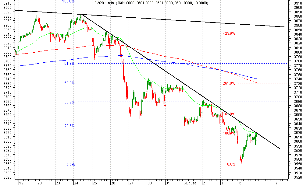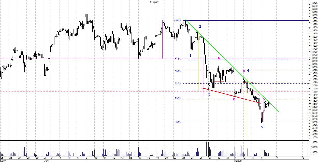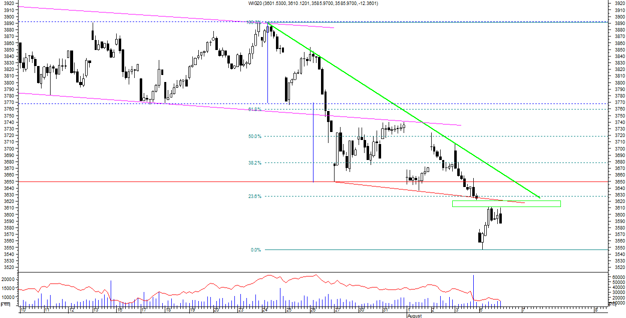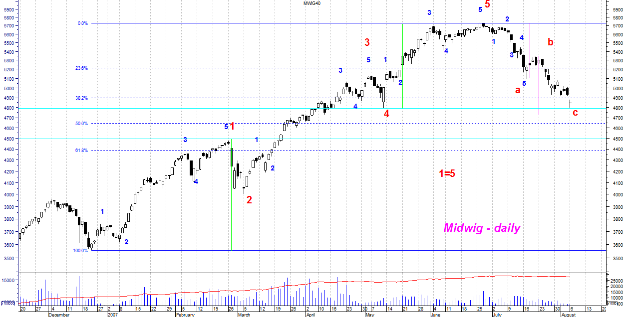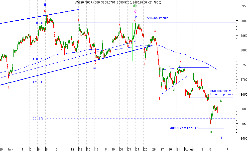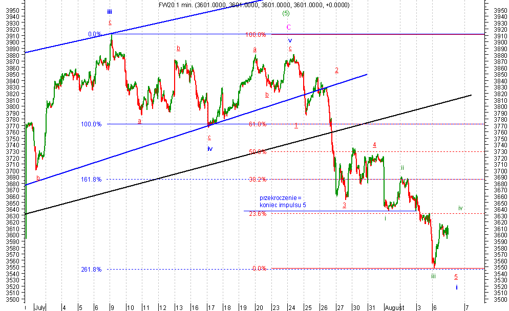 Wig20 nie zdo?a? nawet zamkn?Š luki, natomiast zako˝czenie notowa˝ kontraktˇw na plusie, Âwiadczy o wyczekiwaniu na korekcyjne odbicie w obliczu znacznego wyprzedania rynku. Sprzyja temu widoczna na wykresie fw piŕciofalowa struktura spadkowa, zapowiadaj?ca mo?liwy korekcyjny wzrost. W przypadku pozytywnego zako˝czenia sesji w USA, na futach mozliwe jest wymalowanie nieco koÂlawej orgr z ruchem minimalnym do ok. 3680, natomiast w przypadku spadkˇw, poniewa? fala 4 by?a pŕd??c? trˇjk? abc - mo?liwy jest jeszcze spadek do 3500 w ramach fali 5.