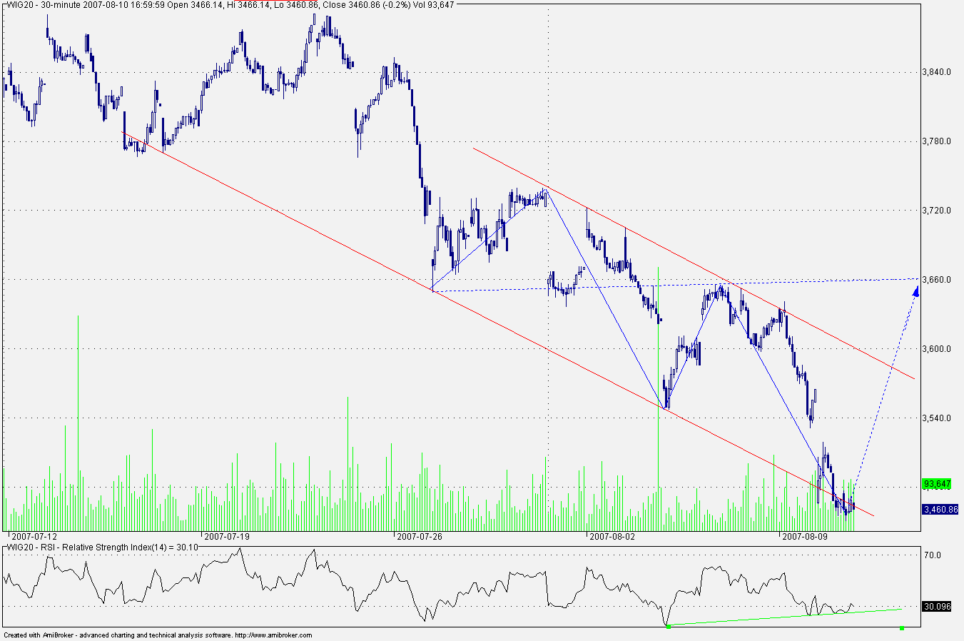 Ode mnie na ?ikend :lol: Jest kilka argumentˇw za wzrostami-pozytywna dywergencja na rsi w20,poza tym wpadliÂmy w lukŕ ktˇra widaŠ na w20 day,no i prawdopodobny koniec pi?tki czyli fala druga korekcyjna ktˇrej sie nie moge doczekaŠ.Inna spraw? jest wielkoŠ tej korekty myÂlŕ ?e mo?emy dojŠ do 38% zniesienia ca?ego ruchu(minimum) w jego pobli?u znajduje siŕ linia trendu spadkowego,w przypadku pokonania przeszkod? bŕdzie linia spadkowa na rsi ktˇr? zaznaczy?em.Nie bez znaczenia oczywiÂcie DJIA gdzie jak wspomina?em wykres jezeli chodzi o tfl wydaje sie byc ma?o skomplikowany (narazie),chodzi o czas kszta?towania siŕ i g?ŕbokoÂci fali 2 w 3.Je?eli amerykanie zechca znieŠ prawie 100% 1 w 3 fali to wzrosty u nas moga byŠ nawet szybkie i moga zajŠ doŠ wysoko.Ma?o prawdopodobne ?eby na DJIA kszta?otowa?a by siŕ p?aska jako 2 ,ktˇra ju? zaznaczy?em bo 2 rzadko s? p?askie,ale i tak jak by tak by?o podjada w gˇrŕ.pozdro