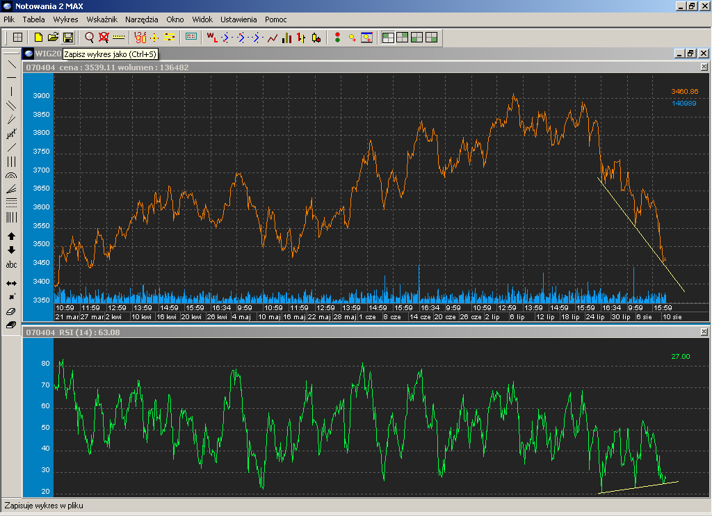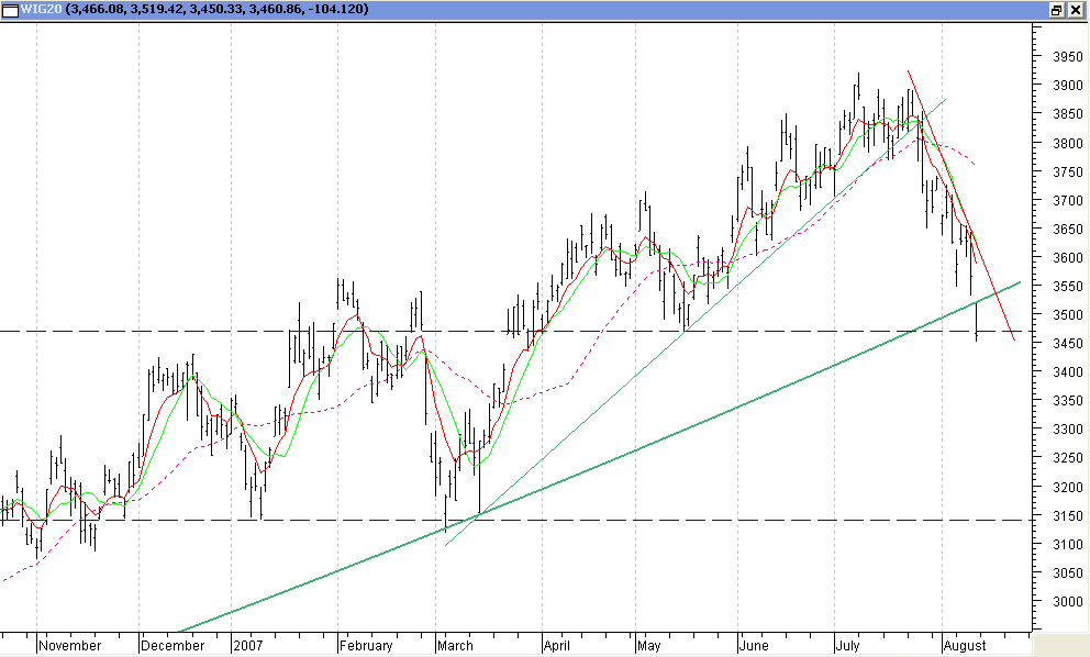 Jednak ciekawe wydaje mi siŕ, ?e w pi?tek WIG20 otworzy? siŕ w?aÂnie w tych okolicach(3466). Wg mnie formacja ta zostanie zanegowana jeÂli WIG20 zamknie siŕ poni?ej 3439.