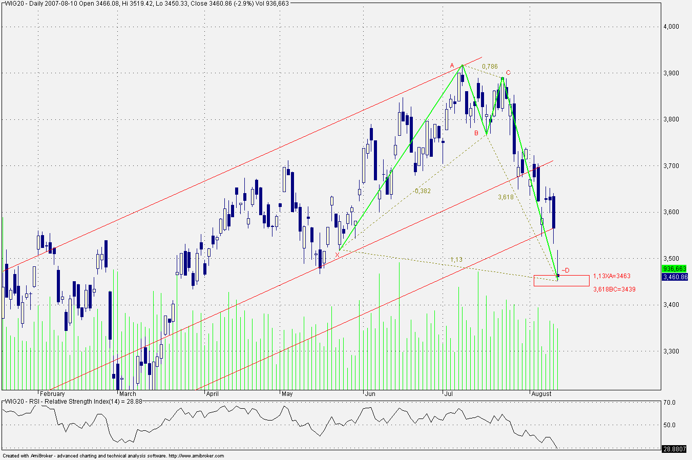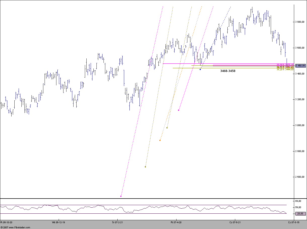 Na dziennym wykresie WIG 20 widaŠ bycz? strukturŕ harmoniczn? Bat(zielone linie), ktˇrej koniec wypada pomiŕdzy 3463-3439, akurat na wa?nym wsparciu, wynikaj?cym z na?o?enia na siebie kilku zniesie˝ Fibo.
