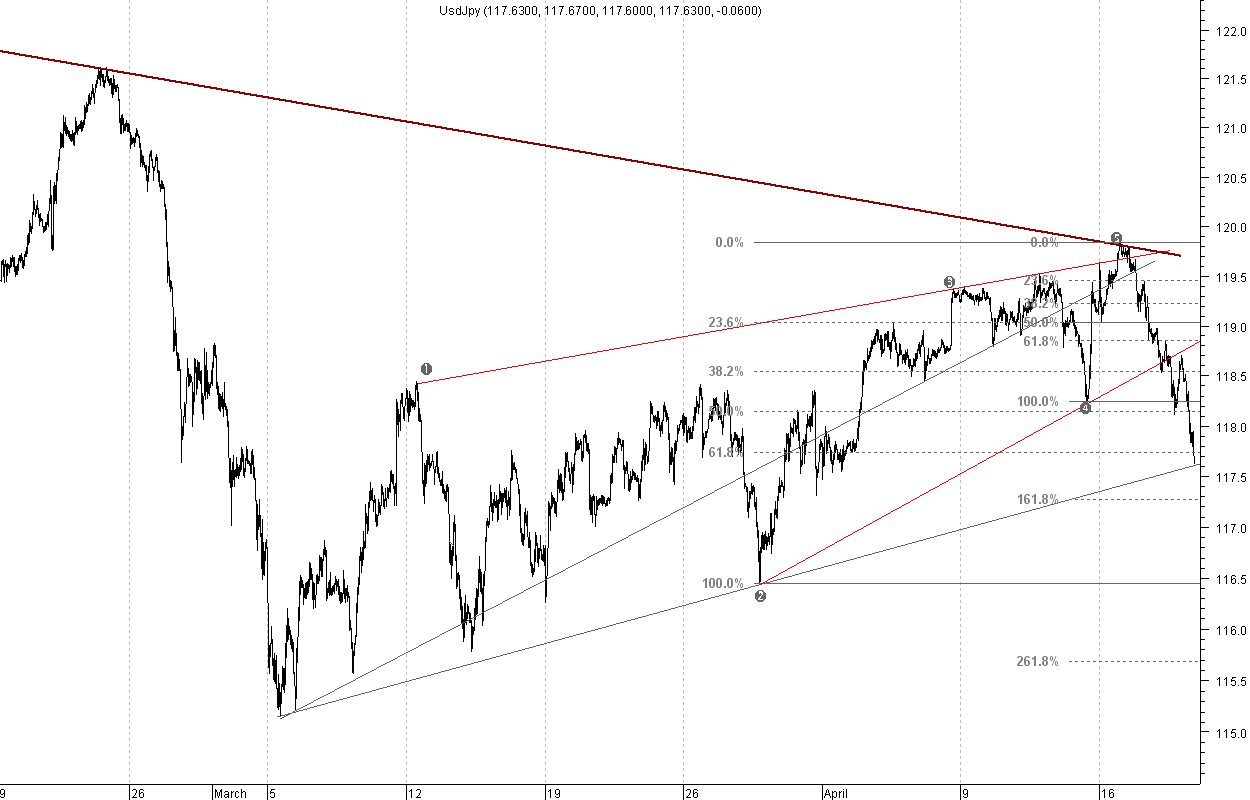 rˇwnie? za wiarygodny sygna? zamkniŕcia L mo?na by?o wczeÂniej potraktowaŠ za?amanie chor?giewki pokrywaj?ce siŕ z przebiciem linii trendu wzrostowego. Na fw ciekawostk? jest, ?e kontrakt zako˝czy? up na 1,618 poprzedniej fali spadkowej.