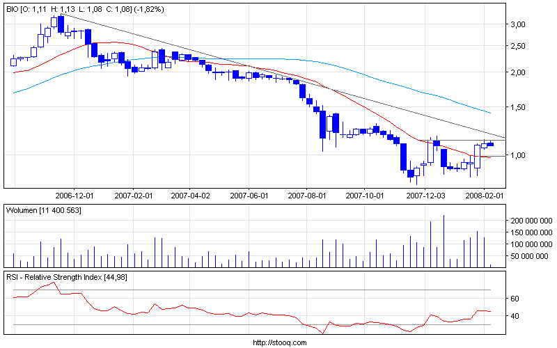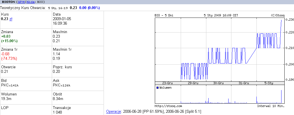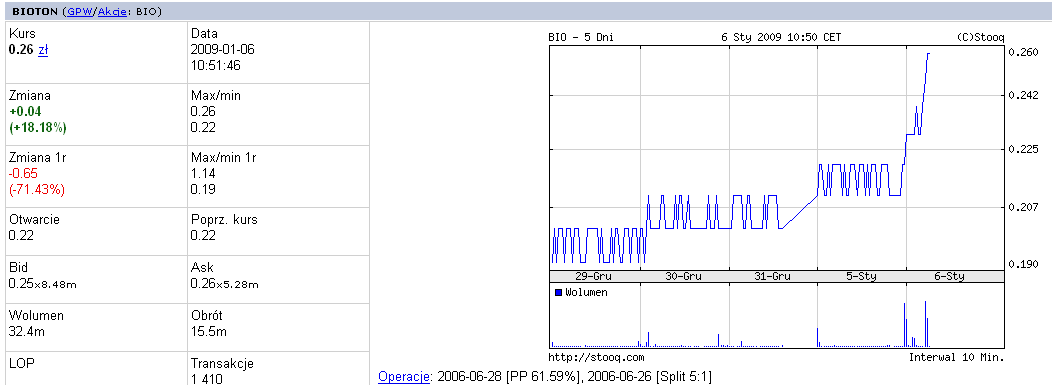 O godzinie 13.35 akcje Biotonu zyskiwały 3,45 procent do 30 groszy, podczas gdy WIG20 rósł o 0,84 procent. Bioton zyskał od początku roku 45 procent.