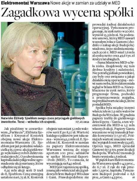 Przypomnijmy, ?e El?bieta Sjoeblom by?a jednym z inwestorˇw, ktˇrzy przed rokiem kupili od Mostostalu Export spˇ?kŕ MED, w?aÂciciela wiŕkszoÂciowego pakietu gie?dowego Budopolu Wroc?aw.