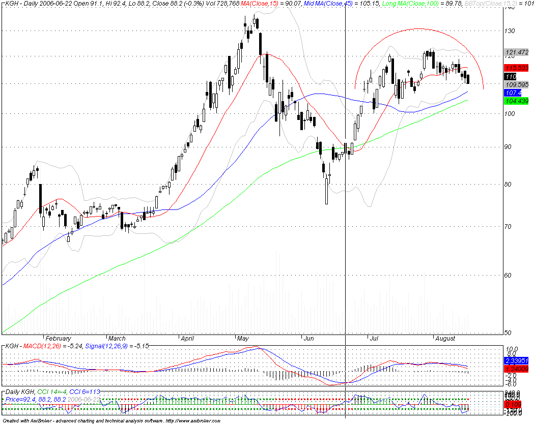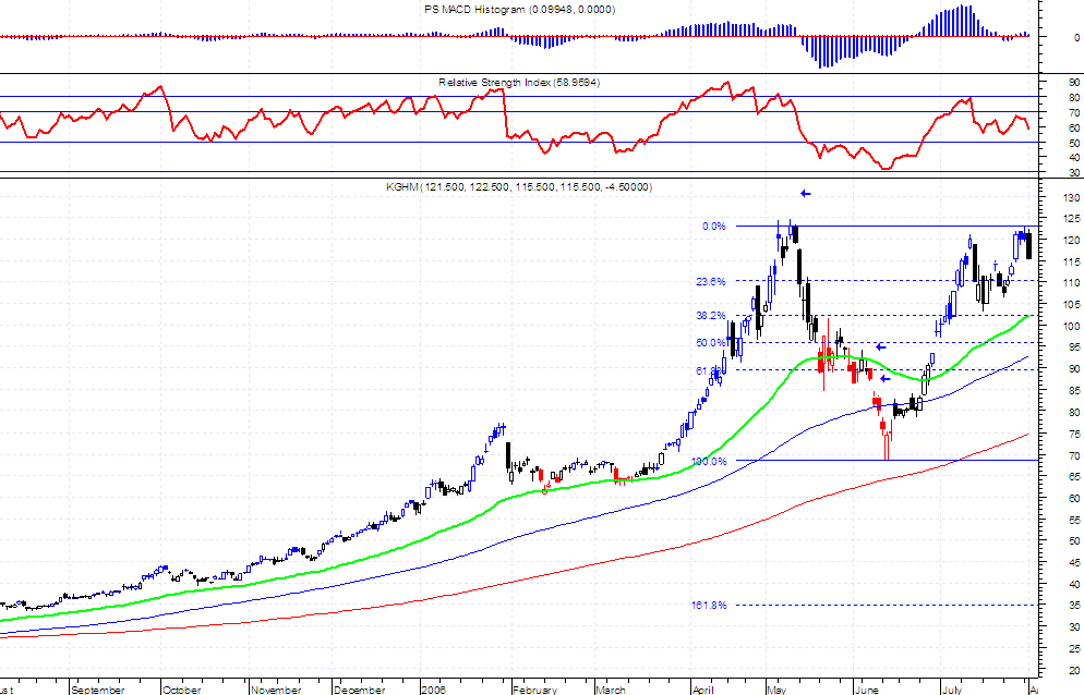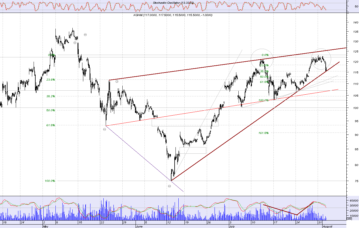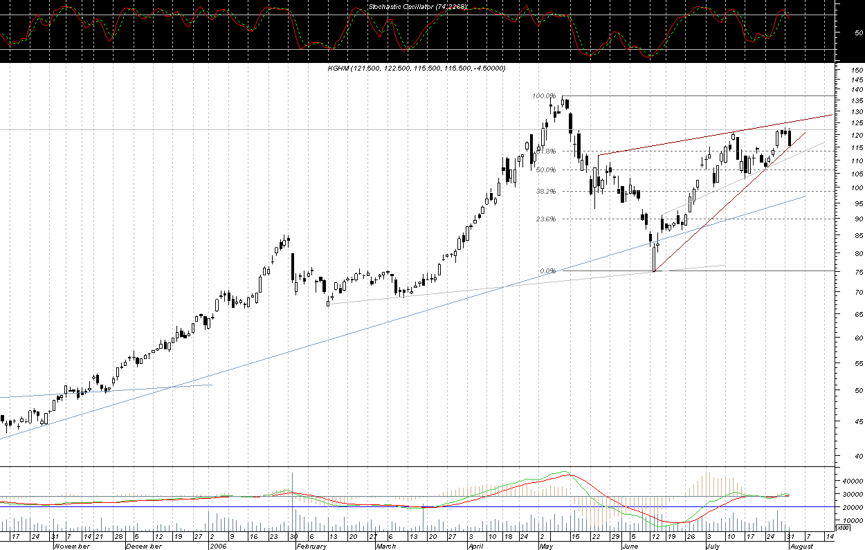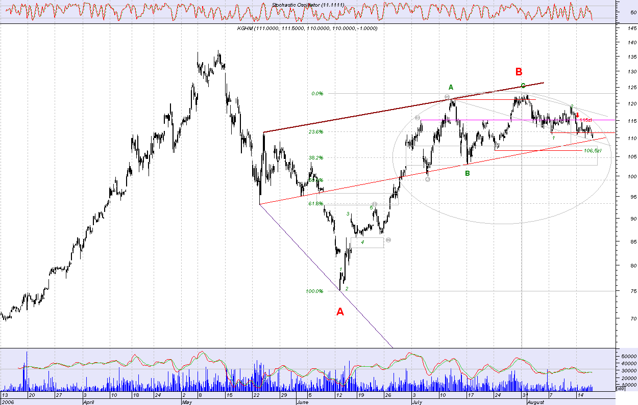 Niedawno wyst?pi?a korekta zatrzymana w okolicy 105 zl i raczej trudno spodziewac siŕ jej pog?ŕbienia. Przebicie szczytu przez kghm hmmm.... to jasny sygna? dla byka......gdzie wtedy bedzie wig20???