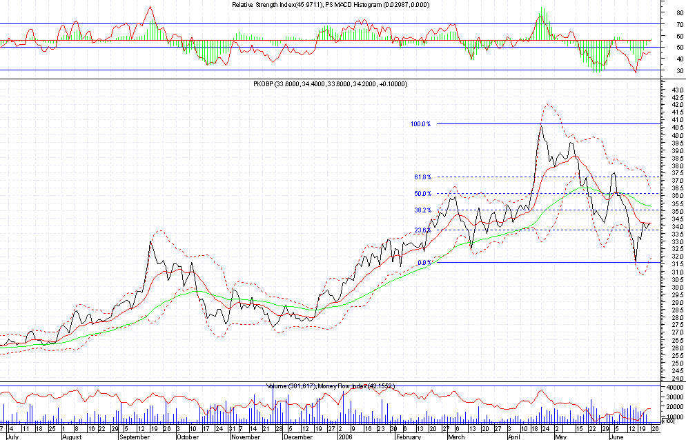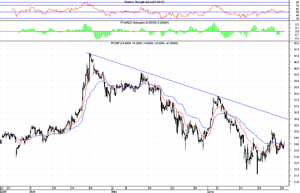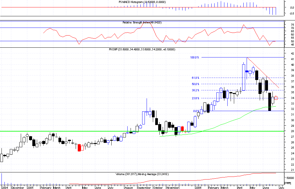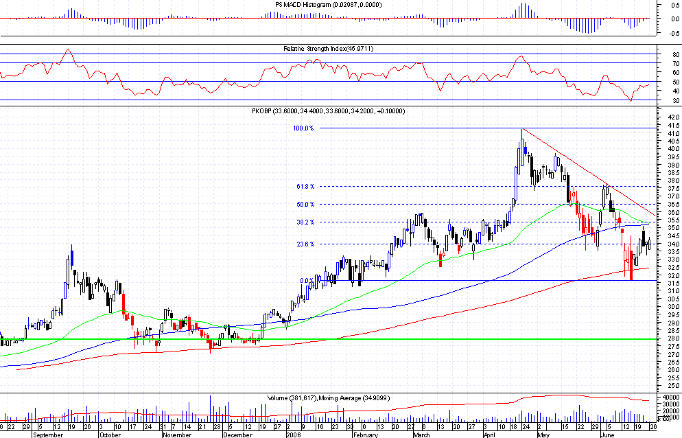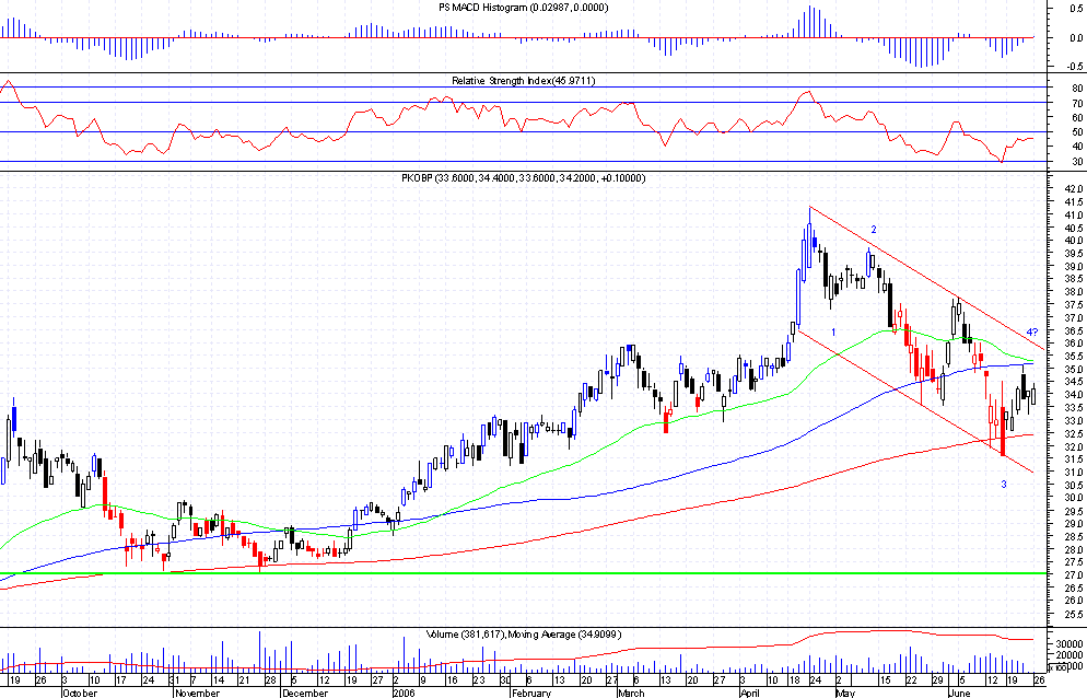 Akcje tego banku poruszaja siŕ w trendzie spadkowym- zauwa?alny kana? spadkow na wykresie day. Fala ma zale?nie od interpretacji 3 lub 5 falow? strukturŕ- ja widze 3 falŕ , obecnie 4 , ktˇr? MACH nakazuje bezwzglŕdnie omijaŠ!!!! Za dobry moment do otwarcia shorta uwa?am testowanie gˇrnej linii kana?u spadkowego. WejÂcie ok 35 zl , stop 38 zl na close ( 61.8 fib), zasiŕg 27- 28 zl. Perspektywa zysku obiecuj?ca.