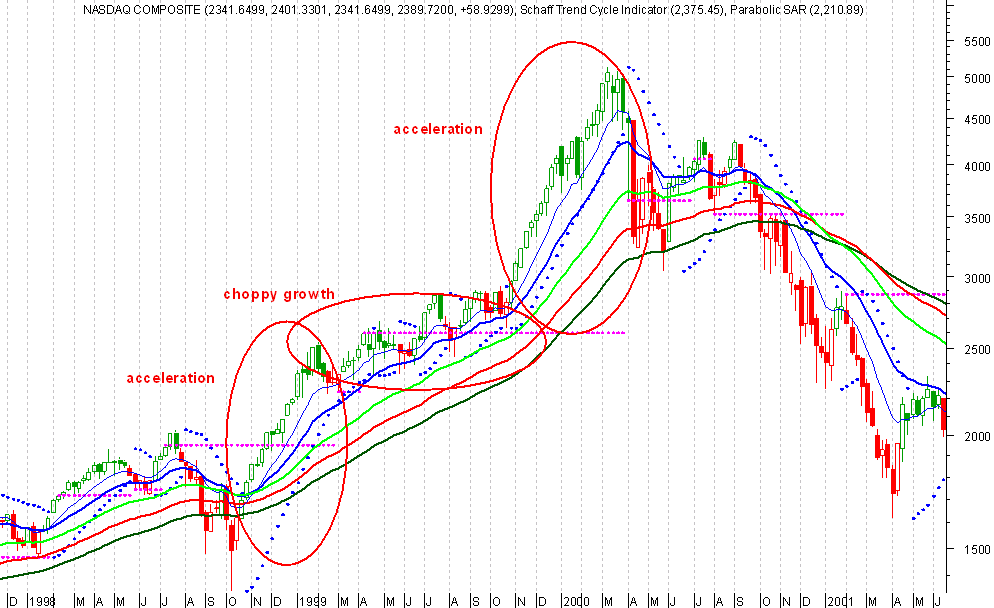 Na poni?szych wykresach zaznaczy?em strukturŕ fal w krˇtkim i d?u?szym okresie (DJI). Z moich obserwacji wynika ?e impuls zaczyna siŕ przyspieszonym wzrostem (acceleration), nast?pnie przechodzi w okres niepewnych, szarpanych wzrostˇw (choppy growth) w ktˇrych wsparciem jest jedna ze Ârednich (dla DJI weekly wygl?da ?e to 100EMA w przypadku d?ugoterminowym i 10EMA w fazie przyspieszonych wzrostˇw) i nastŕpnie znowu przyspiesza. Ten schemat jest powtarzany w d?u?szym okresie rˇwnie?. Mo?na powiedzieŠ ?e struktura odpowiada falom 1,3 i 5.