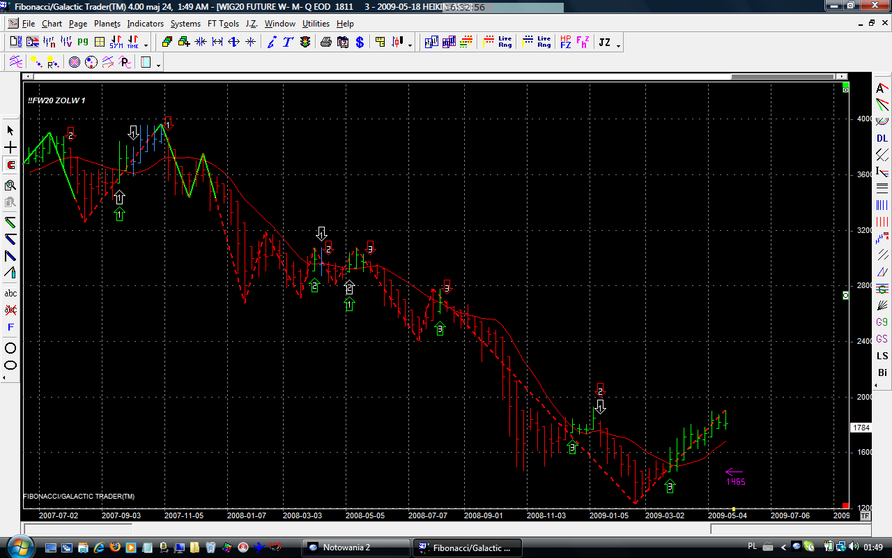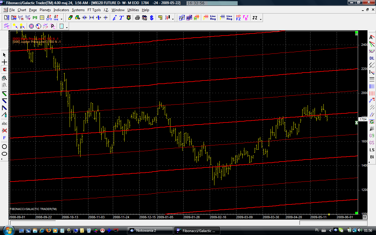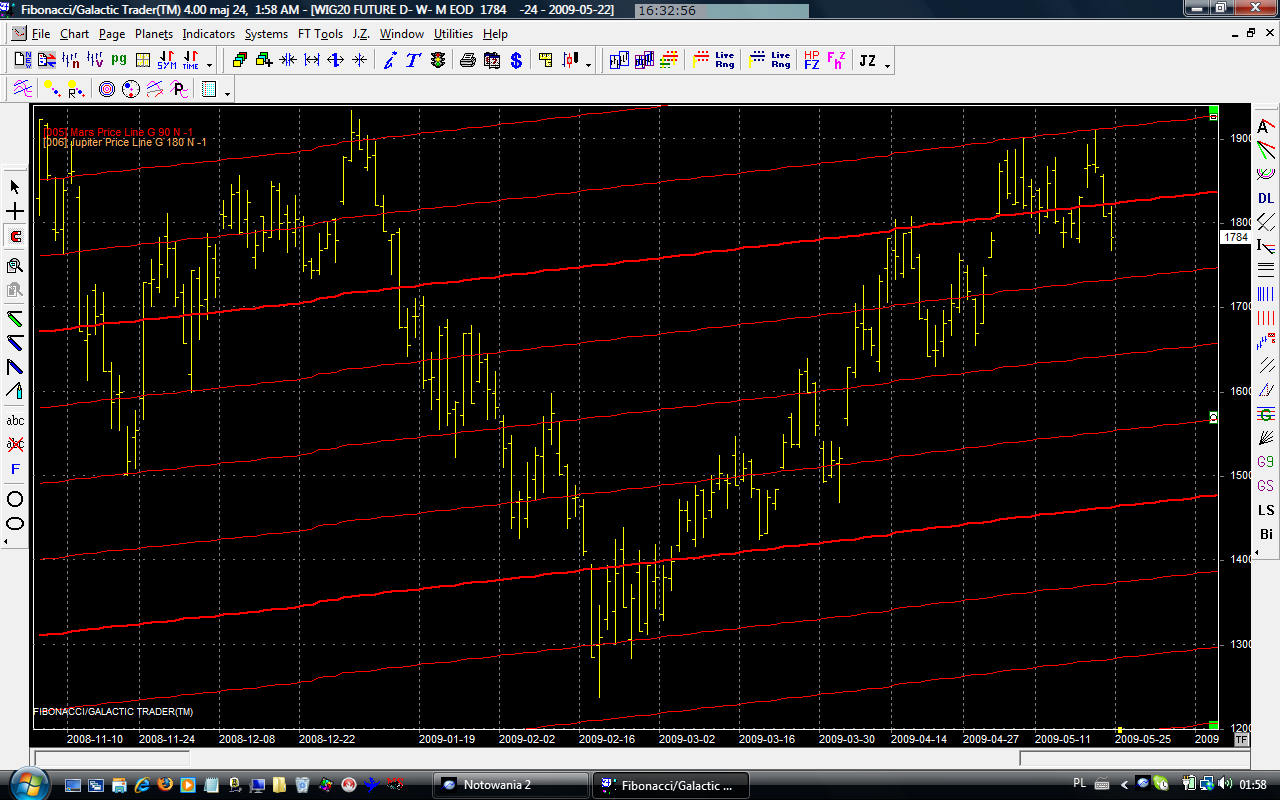 Ciekawa sytuacja miała miejsce na liniach Marsa. Kontrakty dwukrotnie zatrzymywały się mniej więcej w połowie drogi do kolejnej linii i zawracały. Z drugim razem zamknęły się poniżej linii więc wsparcie należy uznać za pokonane. Zastanawiałem się dlaczego akurat w tym miejscu nastąpił zwrot i zmieniłem Universal Clock o takt niżej a więc na 90 stopni. Takie ustawienie zegara kreśli dodatkowe "pomocnicze" linie z reguły o mniejszej wadze. Tym razem jednak okazały się istotne. To ten najniższy wykres.