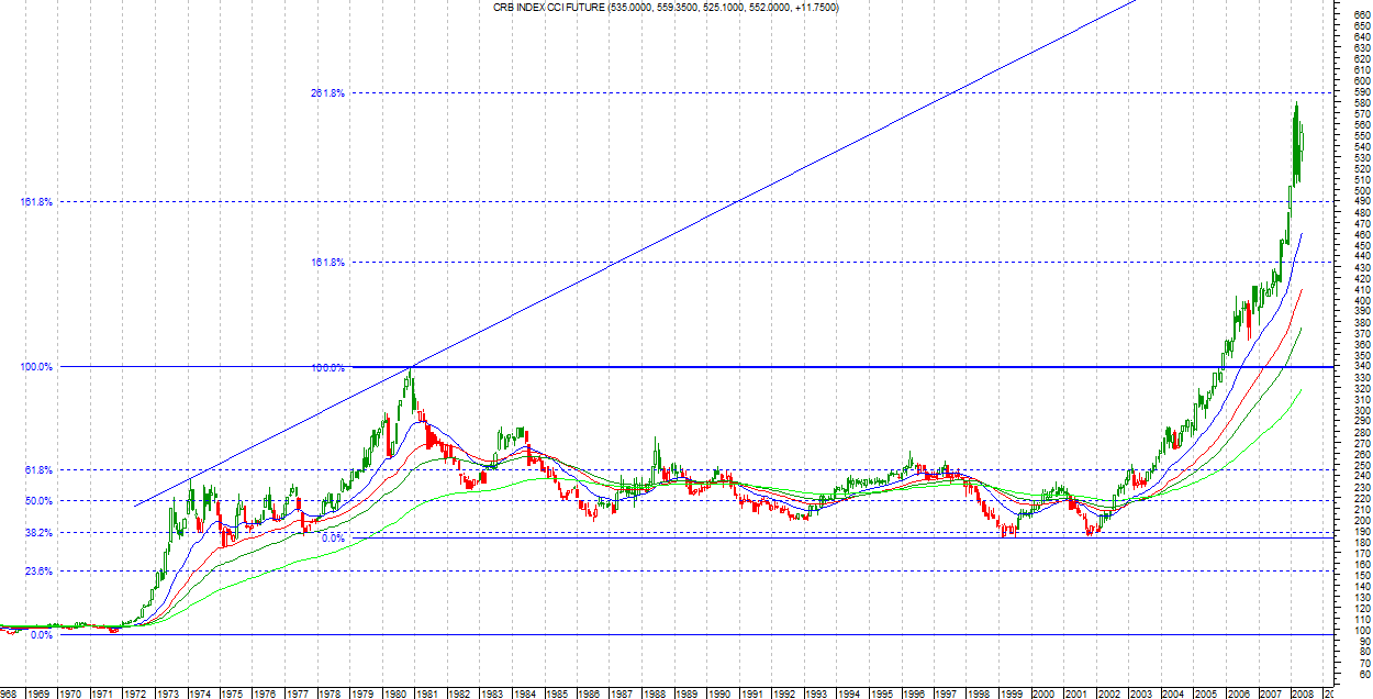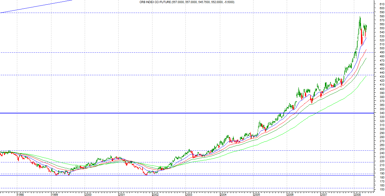 Niestety zginął mi szablon z oznaczeniami ale to co obecnie rysujemy wygląda na czwórkę w piątce. Może przybrać formę trójkąta, z którego powinno nastąpić dynamiczne, acz krótkotrwałe wybicie. Nawet nie chce myśleć co by sie stało gdyby index miał dotrzeć to górnego ograniczenia kanału na wykresie miesięcznym. Obawiam się, że mielibyśmy tu i ówdzie niezłe zamieszki czy też małe rewolucje. Proszę zwrócić uwagę również na to kiedy zaczęły sie obecne wzrosty. Greenspan (wydał ostatnio książkę) może sobie gadać, że "to nie ja" ale wykresy nie kłamią. Koleś będzie się smażyć w piekle o ile go tam w ogóle zechcą.