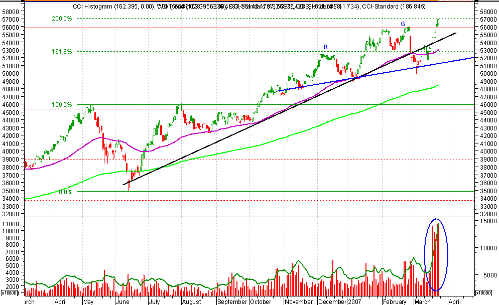 WIG wrˇci? nad linie trendu. Co wiŕcej euforycznie pokona? szczyt. To uprawnia przypuszczenie ?e mo?emy przyatakowŠ 60k punktˇw. Znajduje siŕ tam czerwony fibek bŕd?cy projekcj? ruchu wyznaczon? ca?? bess? po 2000 roku. Wg oznacze˝ robimy falŕ 3 w (5).