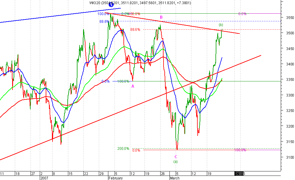 Dynamiczne odbicie od do?kˇw niewiele wyjaÂnia. Wg tego oznaczenia wygl?da to na pierwsz? falŕ w nowym impulsie. PewnoÂci jednak nie mam i nadal sk?aniam siŕ do oznaczenia prezentowanego poni?ej. Na uwagŕ zwraca fakt, ?e indeksy za oceanem maj? nadal sporo do odrobienia do poprzednich szczytˇw podczas gdy na innych rynkach, zw?aszcza u nas widaŠ prawdziw? euforiŕ (wzrosty po 50% w ci?gu jednego dnia na niektˇrych spˇ?kach) i rekordy na szerszych indeksach. Ciekawe. Wg mnie nied?wiedzie w USA wcale nie s? bez szans w tym tygodniu.
