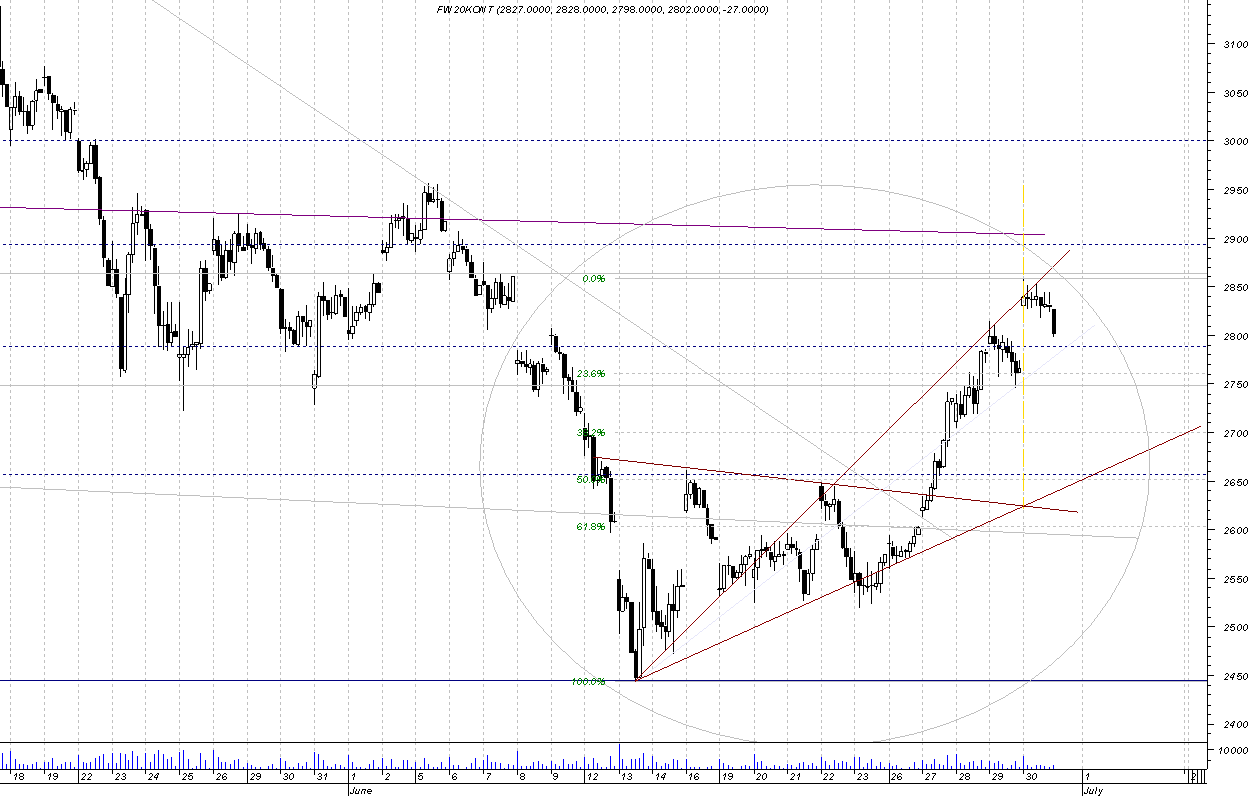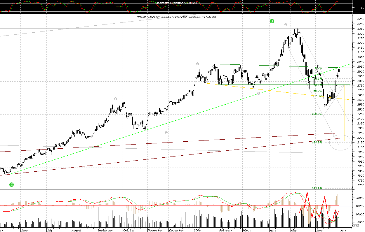 Wig20intra , zgodnie z ktˇr? spadki (ABC) siŕ zako˝czy?y, a fala B mo?e byŠ fal? 1 nowego impulsu wzrostowego. Jednak rˇwnie? w tym przypadku indeks powinien "odreagowaŠ" ubieg?otygodniowe wzrosty, kreuj?c falŕ 2 nowego impulsu. Reasumuj?c: s? podstawy do oczekiwania "sch?odzenia" indeksu w pierwszej po?owie tygodnia, natomiast w przypadku "trzymania" indeksu lub potwierdzonego wolumenem wzrostu, ktˇry jest rˇwnie? mo?liwy, je?eli dobre nastroje na rynkach Âwiatowych siŕ utrzymaj?, analiza techniczna nakazuje powrˇt do pozycji z ubieg?ego tygodnia. Mi?ego weekendu. Pozdrawiam.